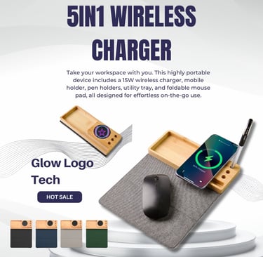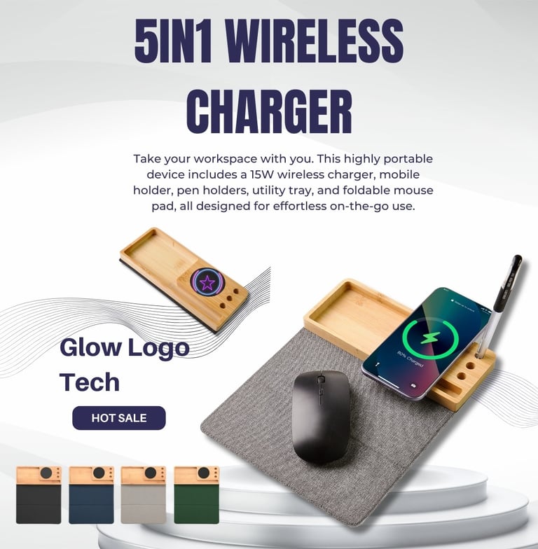 The all-new 5in1 Wireless Charger & Mouse Pad comes with 15W charging, eco-friendly bamboo, and a customizable glow logo. Elevate your space with style.